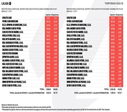 西甲俱乐部的具体调整后电视转播权收入如下: