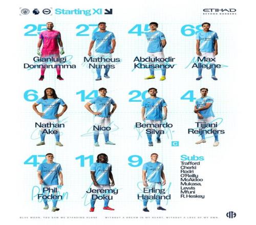 曼城首发:25-多纳鲁马、27-马特乌斯-努内斯、45-胡桑诺夫、68-阿莱恩、6-阿克、14-尼科-冈萨雷斯、20-伯纳多-席尔瓦、4-赖因德斯、47-福登、11-多库、9-哈兰德