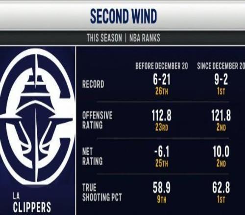 值得一提的是,在球队处于6胜21负的糟糕战绩时,球队主帅泰伦-卢曾表示“快船队要以35胜20负的战绩打完剩余的55场比赛”,这一言论在当时曾遭到多方嘲讽。但在自那之后的12场比赛中,快船队取得了骄人的10胜2负的战绩,目前已经从一度最低的西部倒数第一升至西部第11,距离附加赛区第10名的灰熊仅差1场的差距。